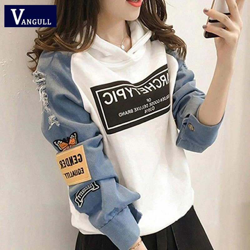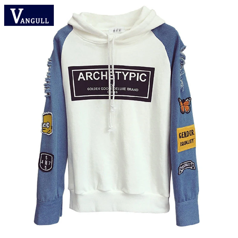 Promo Vangull Harajuku Sweatshirt Women Letter Print Patch Women Hoodies 2019 Autumn New Hole Long Sleeve