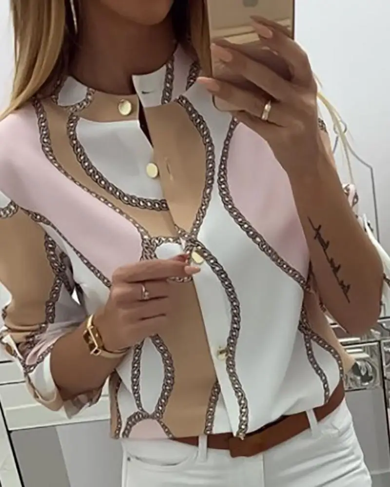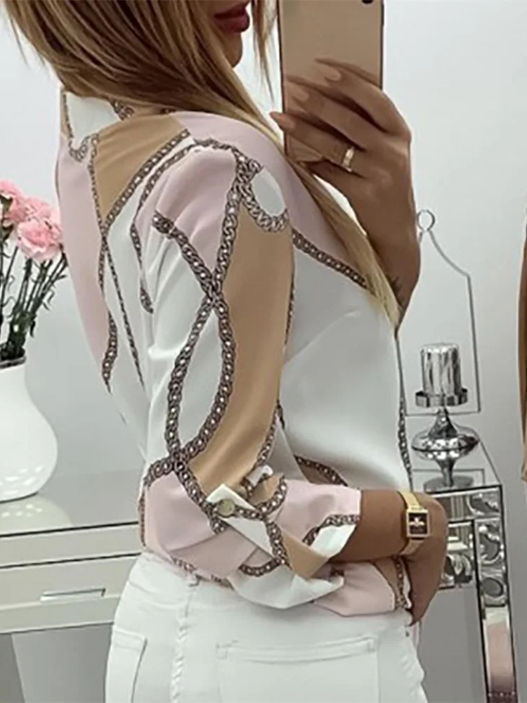 New 2020 Autumn Women Elegant Leisure Top Female V-Neck Basic Shirt Adjustable Sleeve Chains Print Butt