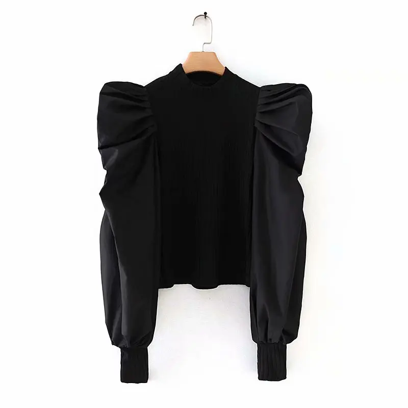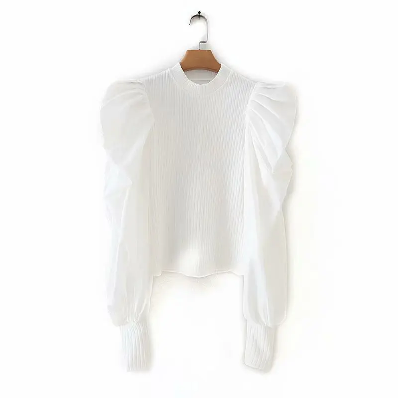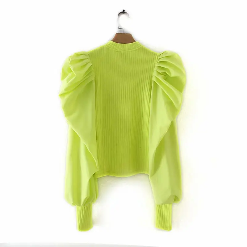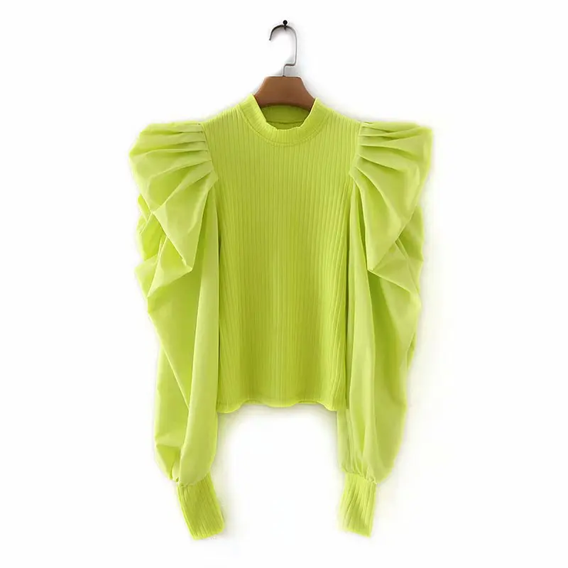 New women solid color pleats cascading ruffles patchwork knitted casual slim blouse shirts women chic b