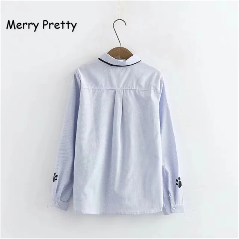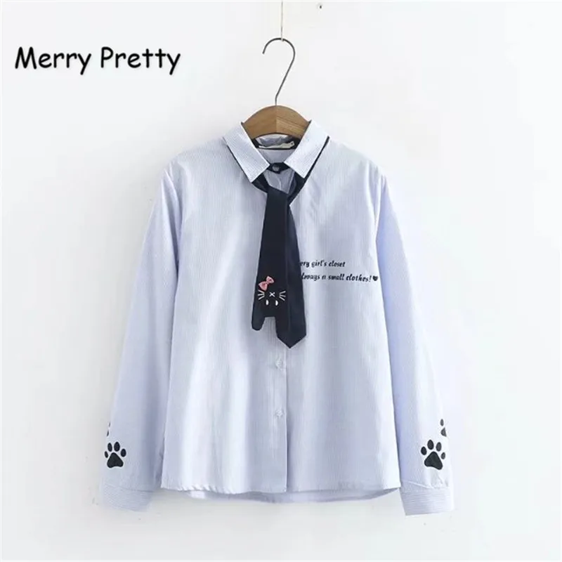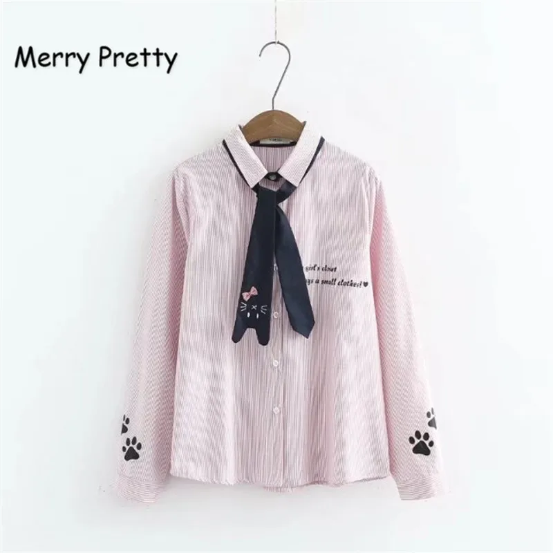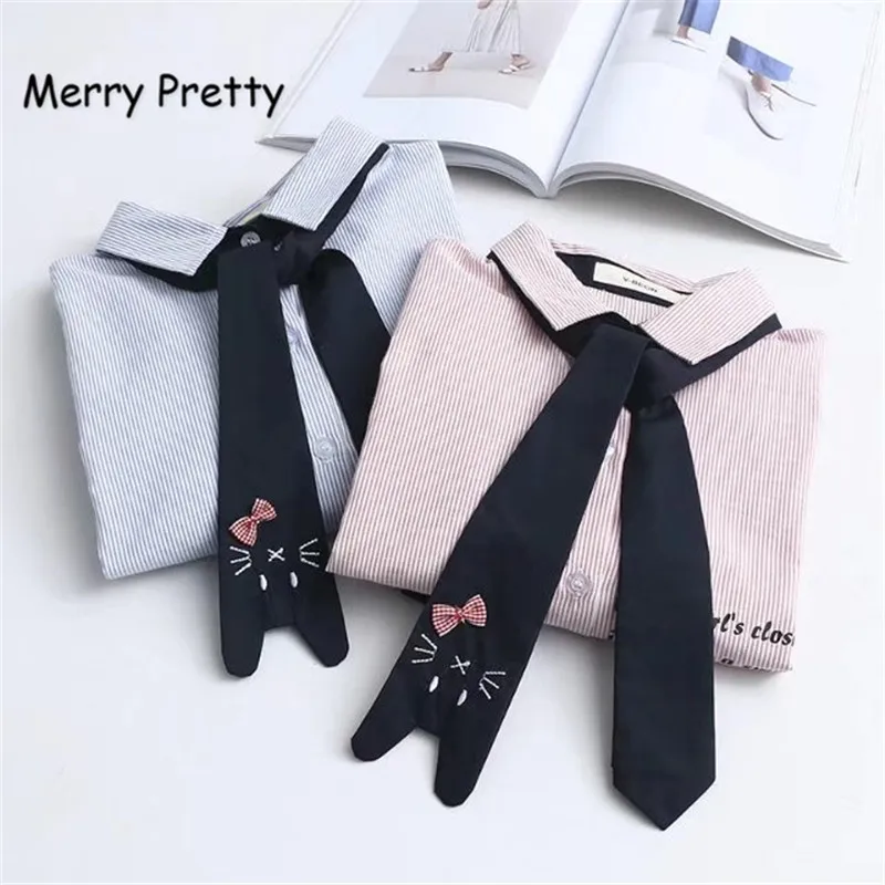 Promo Merry Pretty Spring Women's Shirt Preppy Style Cute Necktie Cat Letter Embroidery Vertical Striped