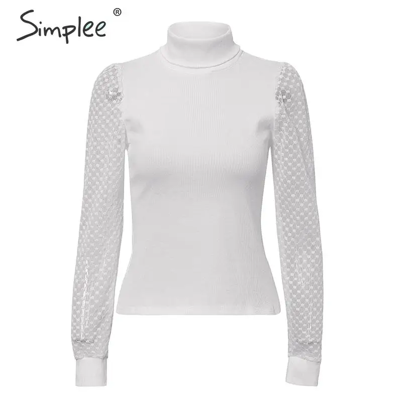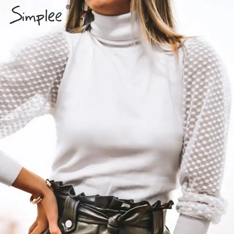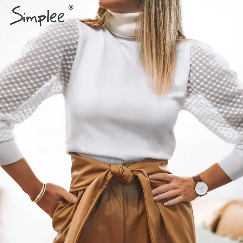 Promo Simplee Elegant lace sleeve patchwork women blouse Turtleneck autumn winter female knitted tops Str