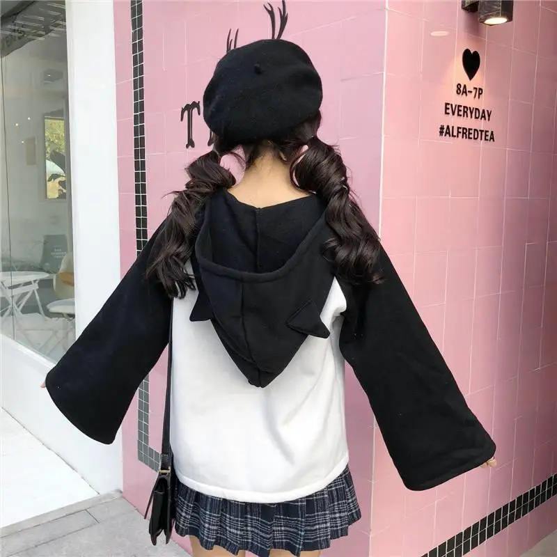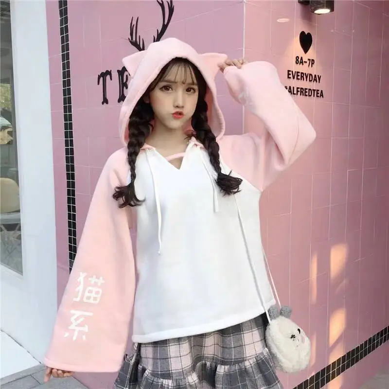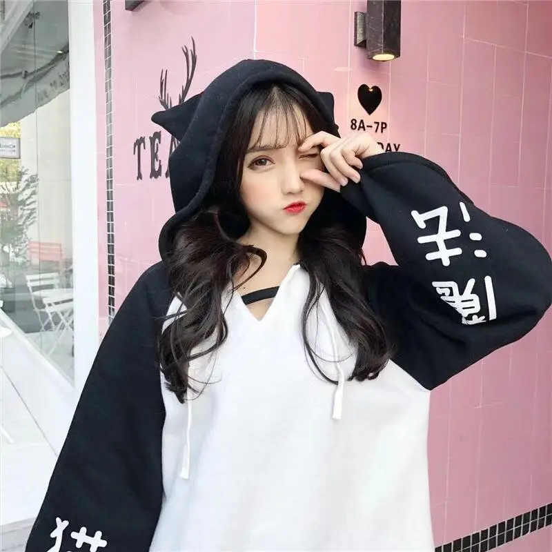 Today i want to review about spring Japanese New cat magic print color matching women pullover top flare sleeve hooded cat ears . I uncover this cool product from China Online Store, best manucafturer.
