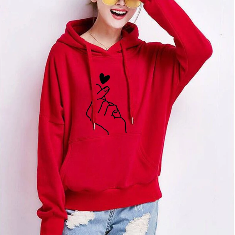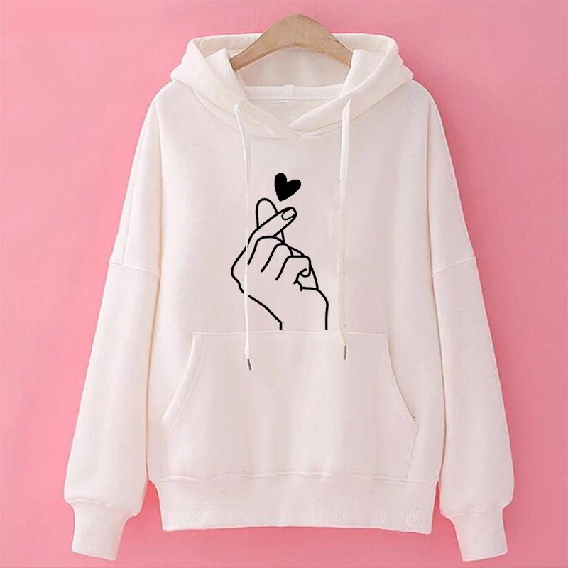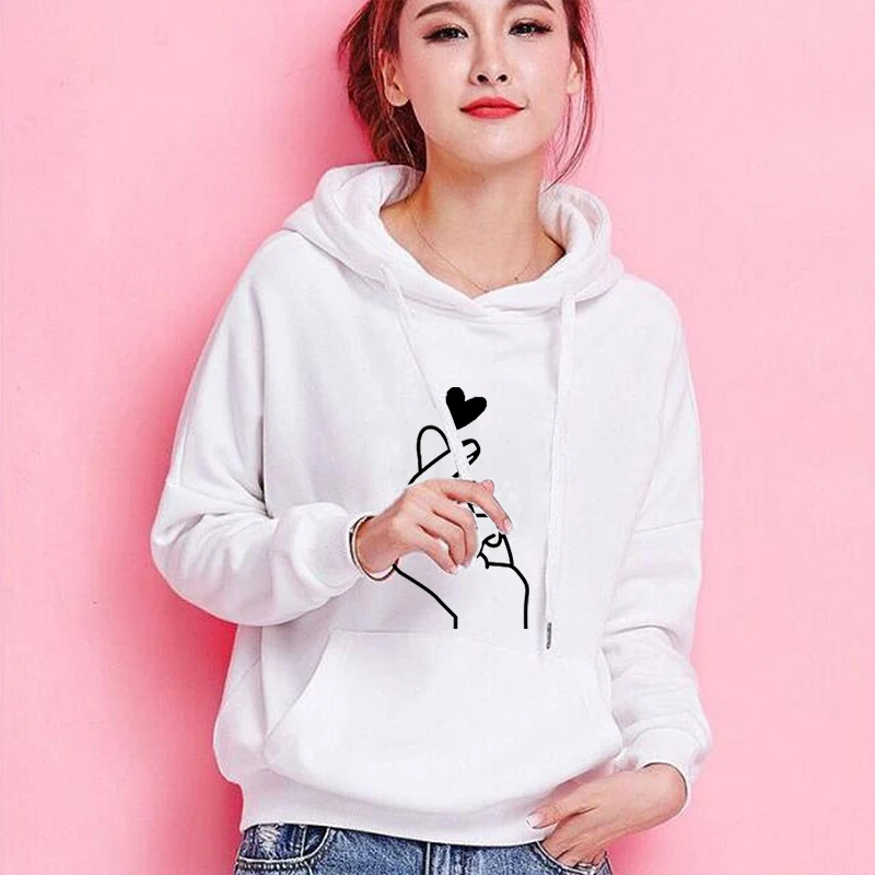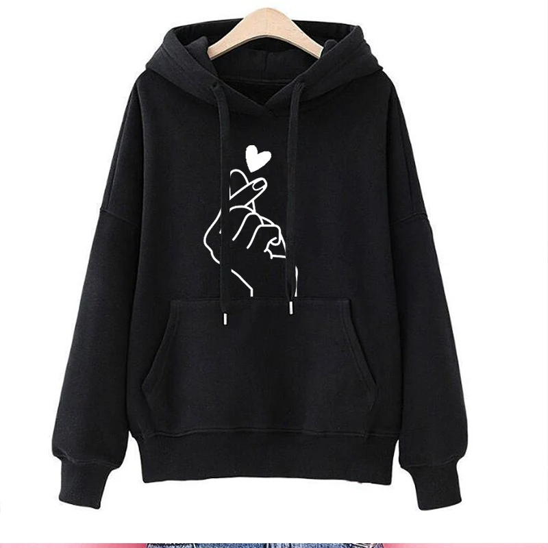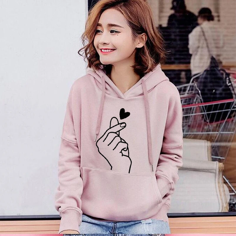 Best Women Hoodies Casual Kpop Finger Heart Love Pattern Hooded Sweatshirts Fashion Long Sleeve Female P