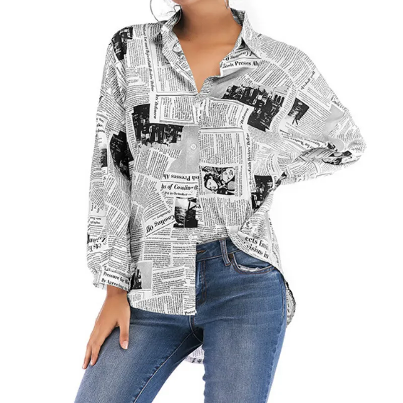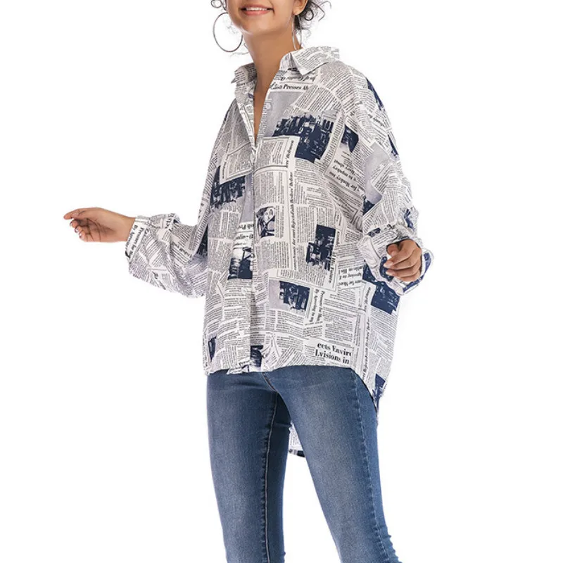 New 2019 Spring Women Letters Print Newspaper Shirts Streetwear Long Sleeve Shirts Plus Size Loose Ladi
